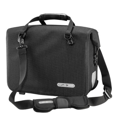 Sykkelveske i stresskoffert-stil med lokk; PU-belagt stoff; avtakbar, polstret skulderreim; bærehåndtak; organiseringsrom; r; reflekser. QL3.1 festesystem. Tilbehør tilgjengelig separat: Tyverisikring (E125); QL3.1: Standard opptil 10 mm rørdiameter; monteringsdeler er permanent festet på venstre eller høyre side av bagasjebrettet; baksiden av vesken forblir fri for forstyrrende kroker. Tilbehør tilgjengelig separat: QL3.1 klemmer for 11–14 mm rørdiameter (E190).
